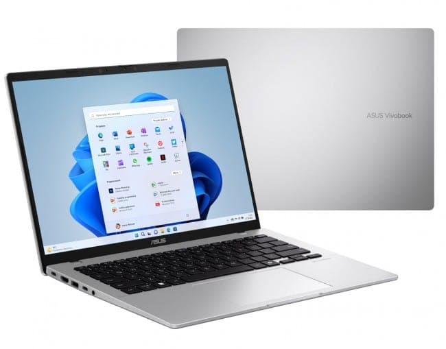 ASUS Vivobook 14 cechuje się nowoczesnym designem w chłodnym srebrnym kolorze i ergonomiczną konstrukcją ważącą zaledwie 1.39 kg. Jego kompaktowe wymiary sprawiają, że jest idealnym towarzyszem w podróży, gwarantując jednocześnie elegancki wygląd.